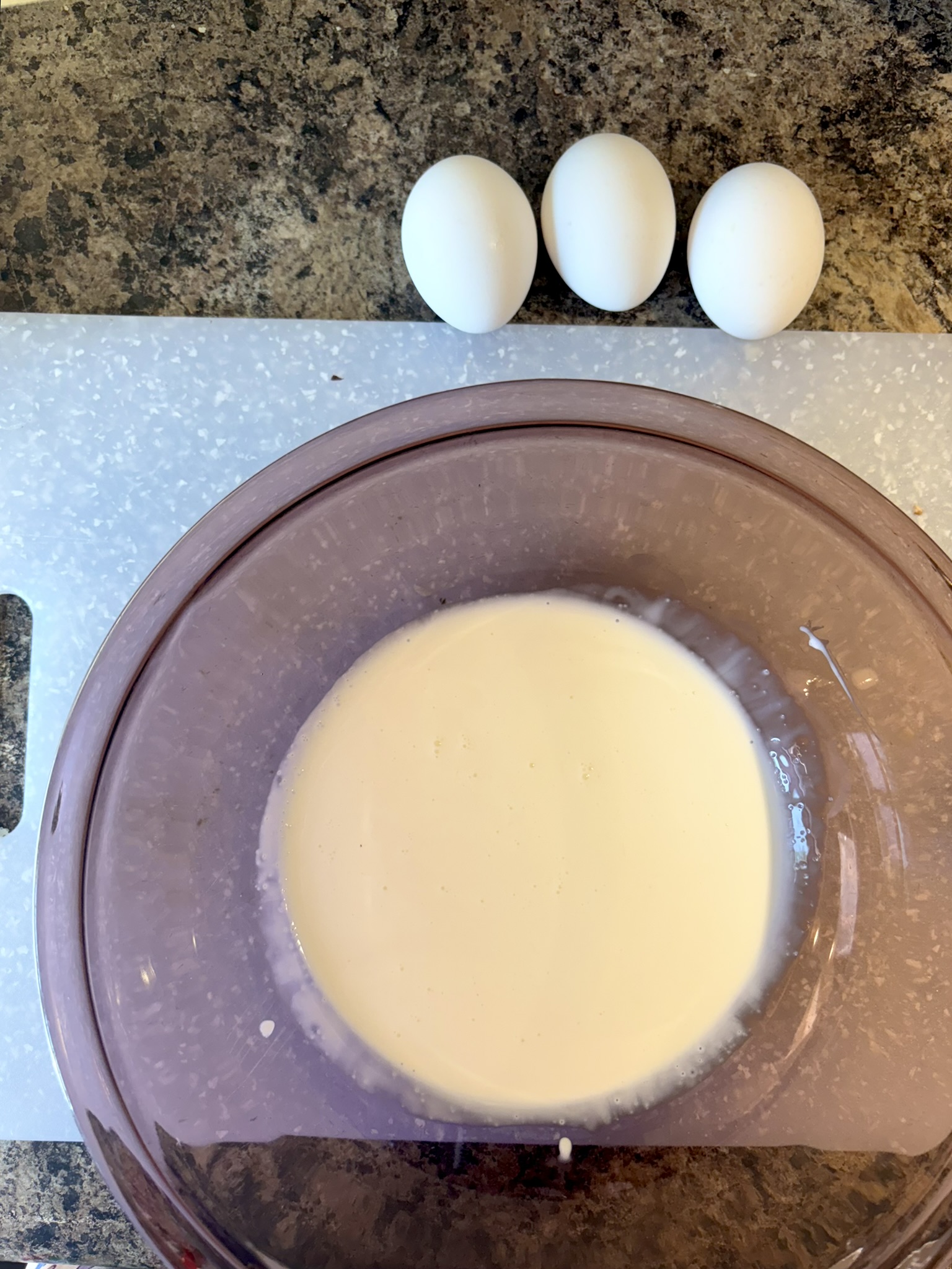 - Whisk custard — Beat together eggs, milk, cream, salt, and pepper until smooth.