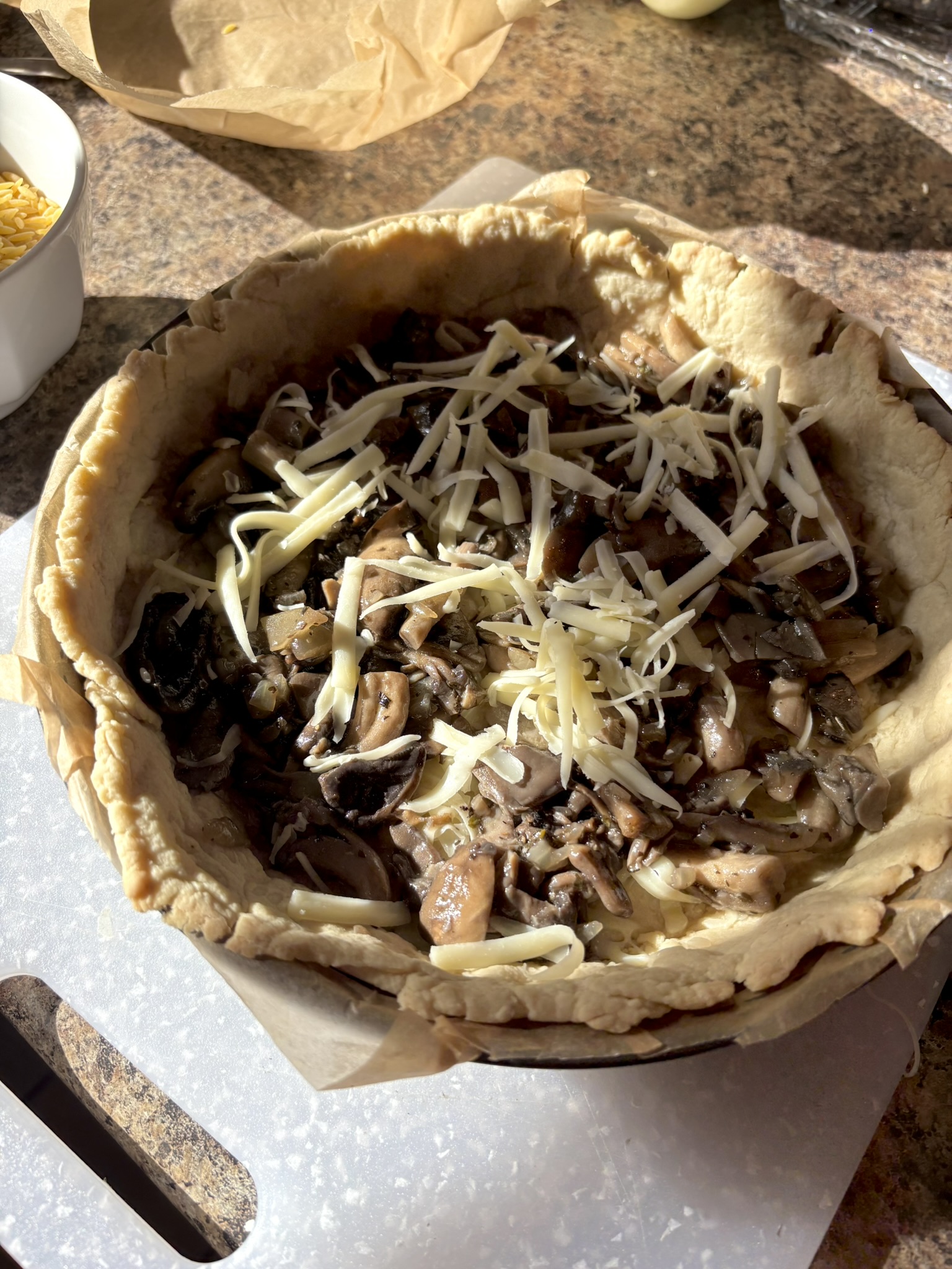 - Assemble quiche — Pour custard evenly over the mushroom-cheese filling.