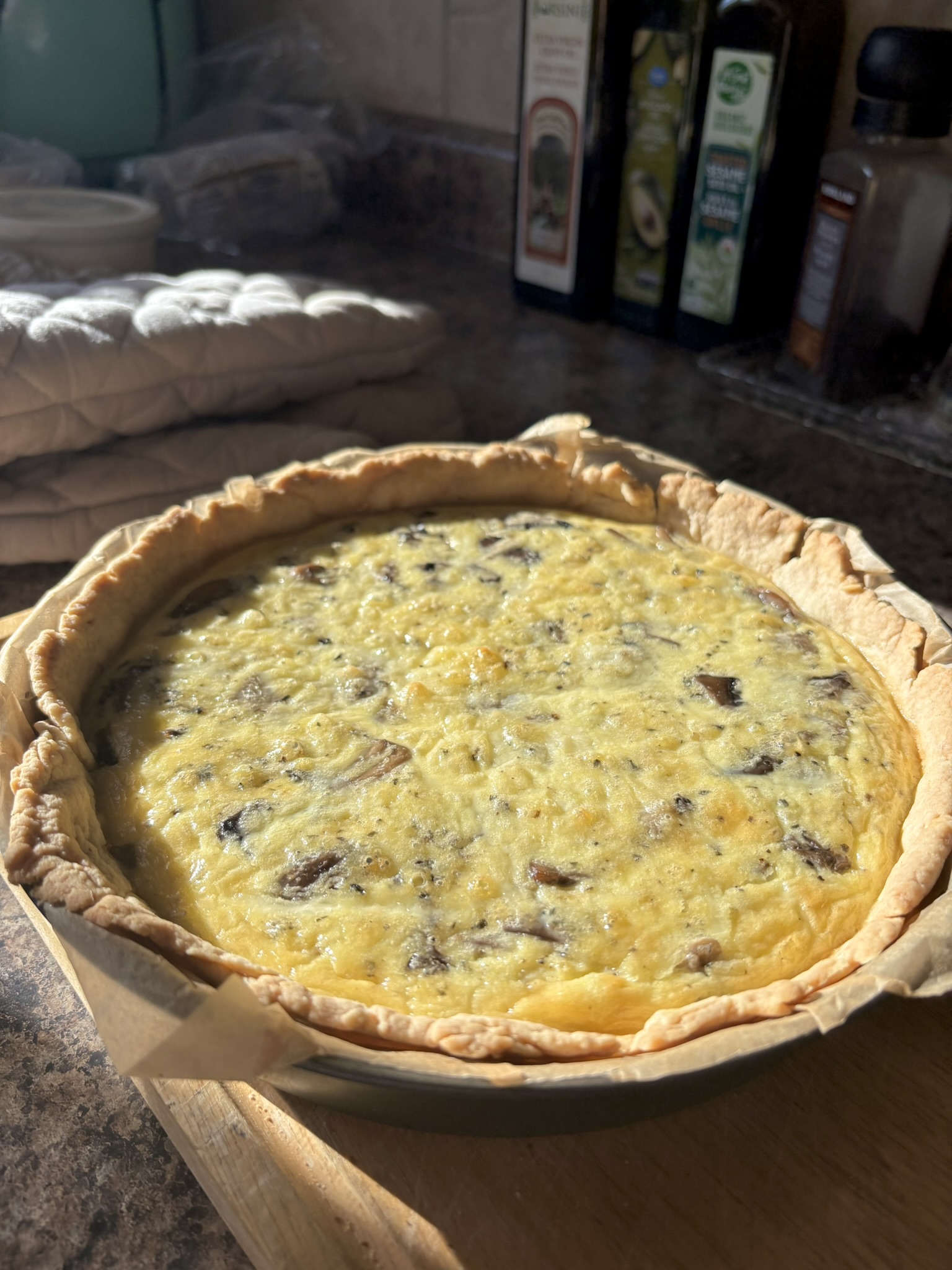 Quiches call for creativity, too. You can experiment with various types of mushrooms; I like cremini and oyster. You can combine multiple types of cheeses, such as cheddar, feta, Gruyere. Try adding your favorite vegetables for extra flavor and nutrients! There are endless possibilities for a good quiche.